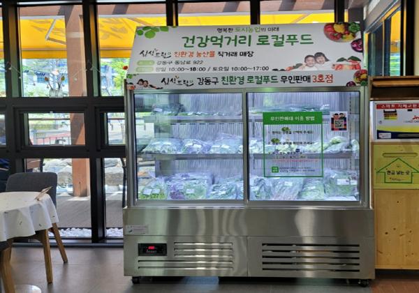 친환경 로컬푸드 무인판매대에서는 ‘당일 수확한 농산물을 당일 판매’한다는 원칙하에 친환경 인증 농가에서 납품되는 신선한 농산물을 유통마진 없이 직접 포장, 진열하고 판매한다. 판매 후 남은 농산물은 신선도 유지를 위하여 저장고에 저장하였다가 익일 오전까지 판매하며, 그 후 남은 농산물은 수거하여 저소득층을 위한 강동푸드마켓에 기부하고 있다.