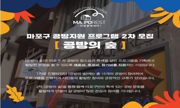 [한국쇼핑몰뉴스, 최영진기자] 마포구는 지역 내 공방을 대상으로 사업비를 지원해 신종 코로나바이러스 감염증(코로나19)으로 위축된 소비심리 회복 및 공방 활성화에 기여하는 ‘공방 프로그램 지원사업 [공방의숲]’의 참여자를 오는 9일까지 모집한다고 밝혔다.