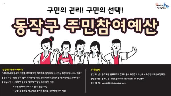 [한국쇼핑몰뉴스, 최영진기자] 동작구가 동작구 주민참여예산 제안사업을 공모한다고 10일 밝혔다.