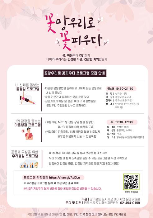「꽃망우리로 꽃피우다」는 망우본동 지역의 소외감 극복 및 포스트코로나시대의 감정 회복을 도모하는 프로그램으로 오는 5월 23일까지 지역 주민을 대상으로 접수받아 5월 말부터 망우본동 주민공동이용시설에서 본격 진행할 예정이다.