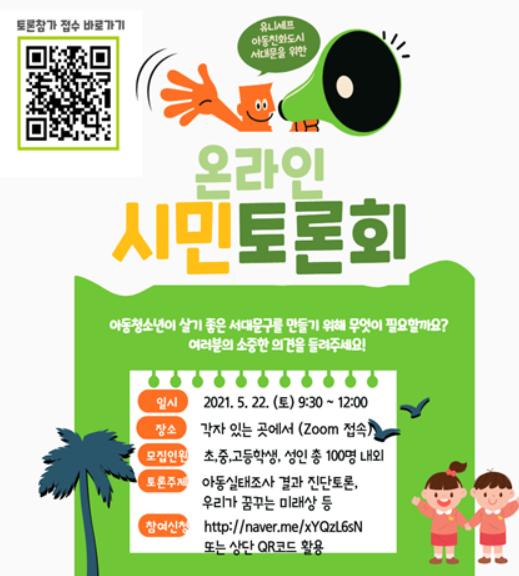 [한국쇼핑몰뉴스, 최영진기자] 서울특별시 서대문구가 이달 22일 오전 9시 30분부터 낮 12시까지 ‘유니세프 아동친화도시 서대문’을 위한 시민들의 다양한 의견을 수렴하기 위해 온라인 토론회를 개최한다.