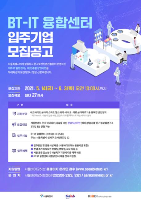 서울시는 ‘BT-IT융합센터’ 입주기업 27개사를 모집한다고 밝혔다. 모집 기간은 5월 14일~6월 3일이며, 서울바이오허브 홈페이지에서 온라인 신청하면 된다.