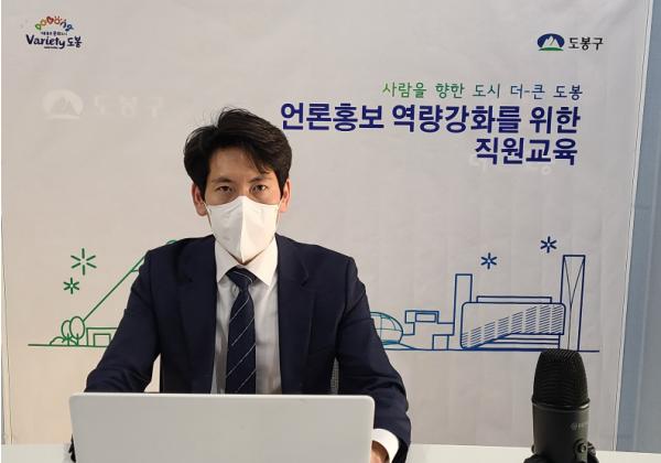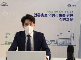프로그램은 감염예방과 교육 참여의 편의성을 높이고자 줌(ZOOM)을 통해 사무실 등 본인이 교육받기 편한 공간에서 PC·휴대전화를 통해 비대면으로 실시됐으며, △도봉구청 중점사업 언론홍보 분석 △보도자료 작성을 위한 모의취재 △시각자료 활용을 통한 언론 게재율 높이기 △질의응답 및 토론 △설문조사의 순으로 진행했다.