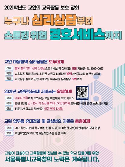 [한국쇼핑몰뉴스, 최영진기자] 서울특별시교육청은 코로나19 방역 일선에서 교육현장을 지키는 교원들이 안심하고 교육 활동에 전념할 수 있도록 교원 마음방역 심리상담 지원 강화,『교원안심공제』 서비스 대폭 확대, 단위학교 교육활동 보호 사업 적극 지원 등으로 교원의 교육활동 보호 정책을 종합적으로 강화한다.