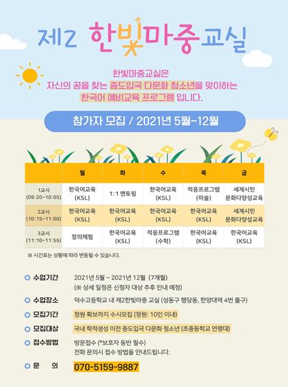 이번에 확대 운영 예정인 「제2한빛마중교실」은 2021년 12월 3일까지 약 7개월 과정으로 운영되며, 서울시에 거주 중인 학적 생성 이전의 다문화 청소년이라면 신청할 수 있다. 「제2한빛마중교실」에서는 한국어교육과 함께 세계시민교육, 문화예술교육, 1:1 멘토링 등을 실시하며, 한국어 교육과정을 240시간 이상 이수하면 서울시교육청 학력심의위원회를 통해 학력을 인정받을 수 있다.