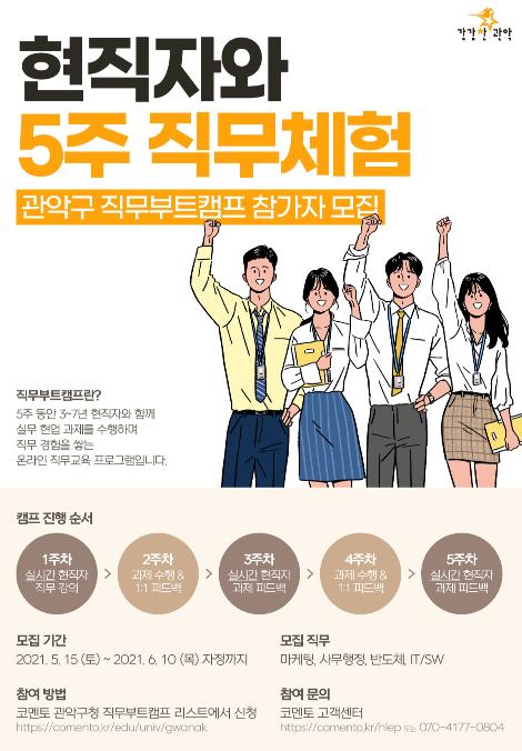 각 캠프당 최대 8명의 청년을 모집하며, 참여를 희망하는 청년은 오는 6월 10일까지 관악구 직무부트캠프 전용페이지에서 원하는 직무를 선택해 신청하면 된다.