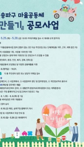 구는 더 많은 신규 주민모임을 발굴하기 위해 올해는 송파구 27개 전동에서 시행하며, 사업별로 100만원을 지원할 계획이다. 해당 동에 거주하거나 생활기반(직장, 학교)을 둔 3인 이상의 신규 주민모임 또는 단체면 누구나 지원 가능하다.