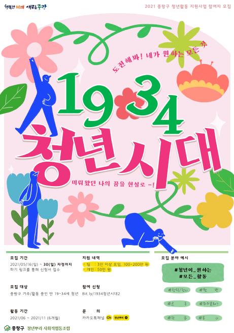 중랑구가 지역 청년들이 일상에서의 소소한 도전을 직접 달성하고 폭넓은 경험을 할 수 있도록 하는 청년활동 지원사업인 ‘1934 청년시대’ 참여자를 모집한다.