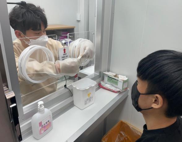 글로브월(Glove-Wall)은 투명 아크릴 벽으로 의료진과 검사자 사이 공간을 분리하고 비닐장갑이 달린 구멍을 통해 환자와의 접촉 없이 검사할 수 있는 시스템이다. 이번에 설치된 글로브월 검체부스는 3개의 검사실로 개별 분리되어 있어 많은 인원을 보다 빠르게 검사할 수 있으며 양압시설과 냉방시설이 갖추어져 있어 감염과 더위로부터 의료진을 보호한다.