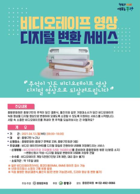 중랑구(구청장 류경기)는 중랑문화원(원장 김태웅)에서 비디오테이프 영상을 디지털로 변환해주는 서비스를 연중 제공한다고 밝혔다.