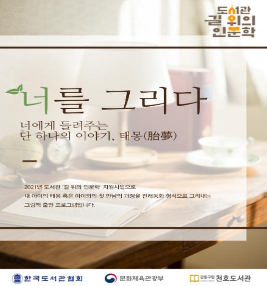 천호도서관은 코로나19의 장기화로 인한 육아 노동의 과중으로, 지친 양육자에게 그림책 제작 과정을 통해 위로의 기회를 제공하고자 한다. 이번 프로그램은 내 아이의 태몽(胎夢) 혹은 아이와의 첫 만남을 전래동화 형식으로 그려내는 그림책 출판 과정으로 “너를 그리다: 너에게 들려주는 단 하나의 이야기, 태몽(胎夢)”을 운영한다.