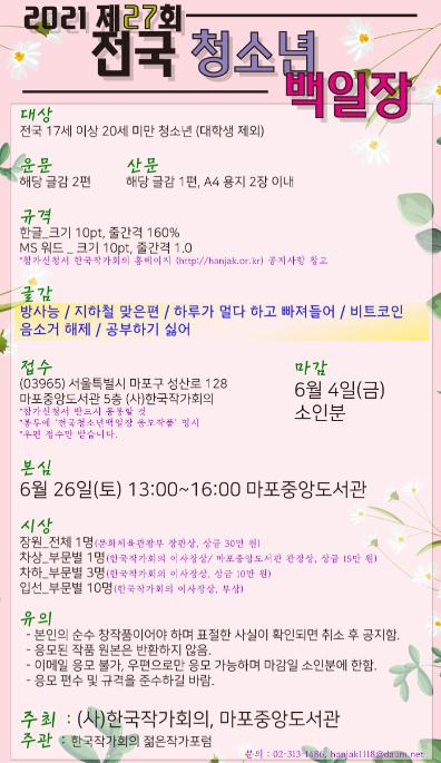 이번 백일장 대회는 전국 17세 이상 20세 미만(대학생 제외) 청소년을 대상으로 운문과 산문 2개 분야로 진행하며, ‘방사능, 지하철 맞은편, 하루가 멀다하고 빠져들어, 비트코인, 음소거 해제, 공부하기 싫어’ 6개의 글감 중 선택할 수 있다.