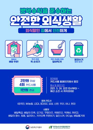 농식품부 노수현 식품산업정책관은 “코로나19 상황이 장기화되고 있어 여전히 국민 개개인이 방역 최일선에 있다는 점을 강조하려는 차원에서 비대면 외식 할인 지원 사업을 추진하게 되었다”며, “코로나19 방역 여건이 개선되면 방역 당국과 협의하여 방문 등 대면외식에 대한 할인 지원 사업도 신속히 개시할 수 있도록 준비에 만전을 기하겠다”고 밝혔다.