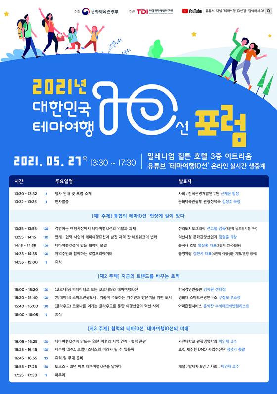 [한국쇼핑몰뉴스, 최영진기자] 문화체육관광부는 (사)한국관광개발연구원과 함께 5월 27일 오후 1시 30분 서울 밀레니엄 힐튼 호텔에서 '2021 대한민국 테마여행 10선 토론회(포럼)’를 개최한다. 특히 관광과 여행에 관심 있는 사람은 누구나 참여할 수 있도록 온라인으로 생중계한다.