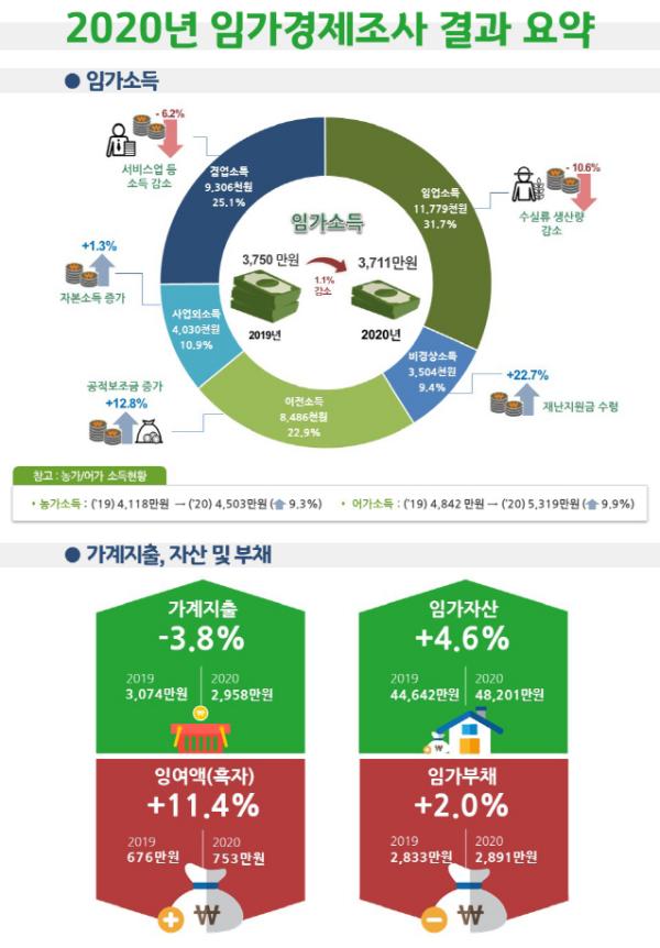 또한, 임가의 평균자산은 4억8천207만 원으로 전년 대비 4.6% 증가했으며, 토지 등의 고정자산이 5.1%, 금융자산 등 유동자산이 2.0% 증가했기 때문이다.