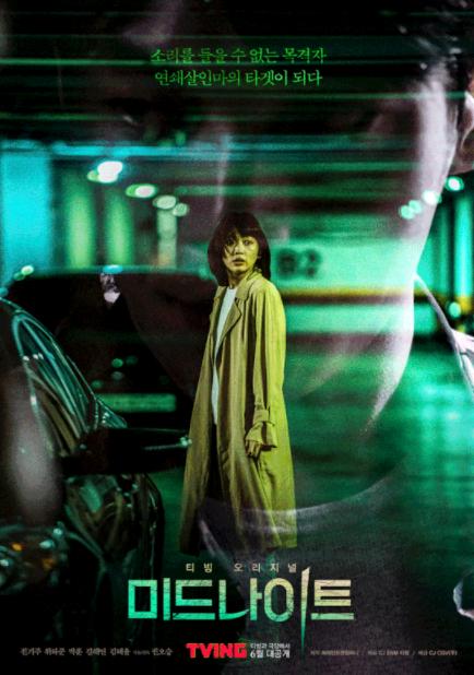 '미드나이트'는 한밤중 살인을 목격한 청각장애인 ‘경미(진기주)’가 두 얼굴을 가진 연쇄살인마 ‘도식(위하준)’의 새로운 타겟이 되면서 사투를 벌이는 극강의 음소거 추격 스릴러.