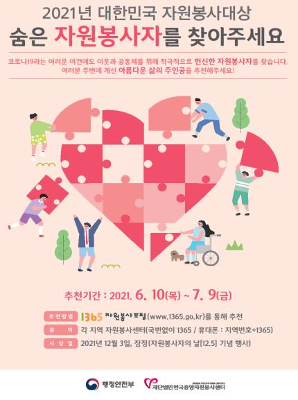 [한국쇼핑몰뉴스, 최영진기자] 행정안전부는 국가와 사회에 헌신한 숨은 자원봉사자를 찾기 위한 ‘2021년 대한민국 자원봉사대상’ 후보자 접수를 이달 10일부터 다음달 9일까지 실시한다고 밝혔다.
