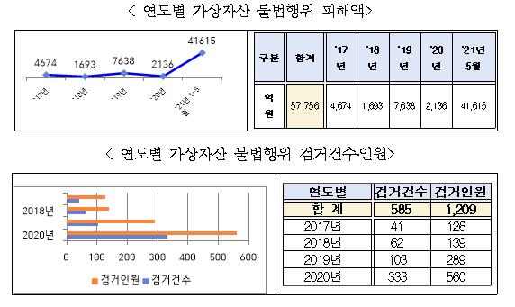 이와 관련, 가상자산 관련 연도별 단속 건수는 2017년 41건(검거 126명)에서 2020년 333건(검거 560명)으로 약 7.1배 증가하였다. 연간 피해액도 2017년부터 최근 4년간 평균 4,035억 원에서 2021년 5월 말 기준 4조 1,615억으로 대폭 증가하였다.