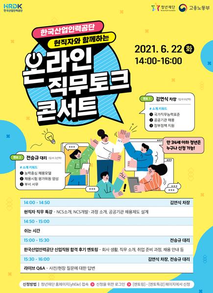 고용노동부와 청년재단이 함께하는 첫 온라인 직무 토크콘서트에는 공사·공기업을 선호하는 청년 수요를 반영하여 ‘한국산업인력공단’의 두 현직자가 재능기부 차원에서 참여했다.