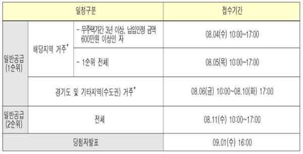 해당지역에 거주하고 있으나, 무주택기간과 납입인정 금액 요건을 갖추지 못한 1순위는 8월 5일에 신청하면 된다. 경기도 및 수도권 거주하는 1순위는 8월 6일부터 10일까지, 일반공급 2순위는 8월 11일에 신청할 수 있다.