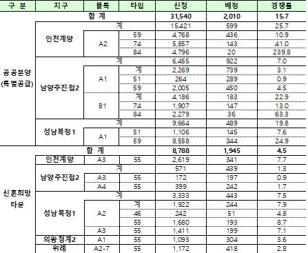 구체적으로 공공분양 특별공급은 총 15.7대1의 경쟁률을 보였으며, 신혼희망타운 당해지역 우선공급은 4.5대1의 경쟁률로 집계되었다.