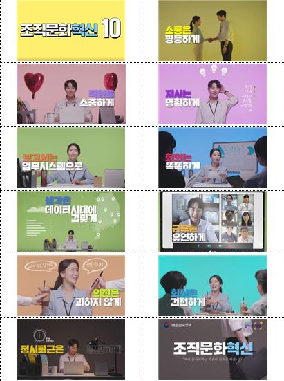 「조직문화 혁신 10」 영상은 구성원들의 상호이해 및 실천이 요구되는 주요 내용을 간결하고 경쾌한 스토리로 연결, 현장에서 조직문화 혁신이 자연스럽게 실행될 수 있도록 구성되었다.