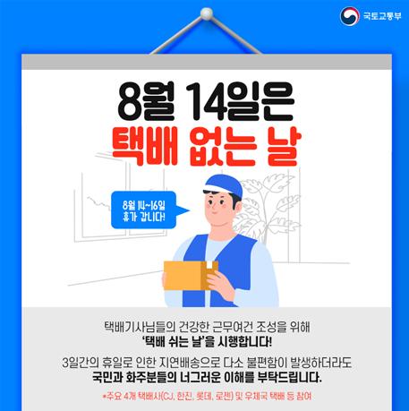 [한국쇼핑몰뉴스, 최영진기자] 국토교통부는 택배업계가 작년에 이어 올해도 ‘택배 쉬는 날(8월 14일)’을 시행할 예정으로, 대체공휴일(8월 16일)까지 포함, 택배 종사자가 폭염 등 혹서기에 최대 3일간 휴식할 수 있도록 지원할 계획이라 밝혔다.