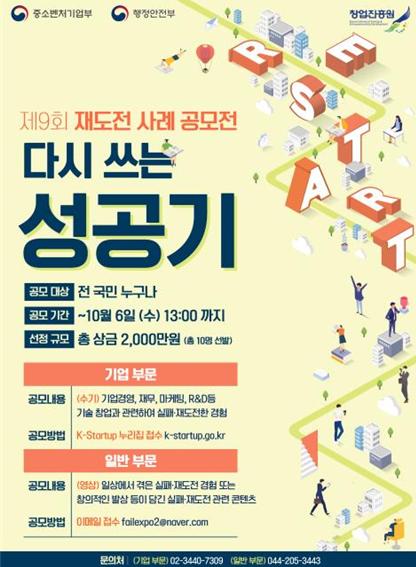 [한국쇼핑몰뉴스, 최영진기자] 중소벤처기업부와 행정안전부는 실패에 대한 사회의 부정적 인식 개선과 재도전 문화의 확산을 위해 ‘제9회 재도전 사례 공모전(다시 쓰는 성공기)’을 개최한다고 밝혔다.