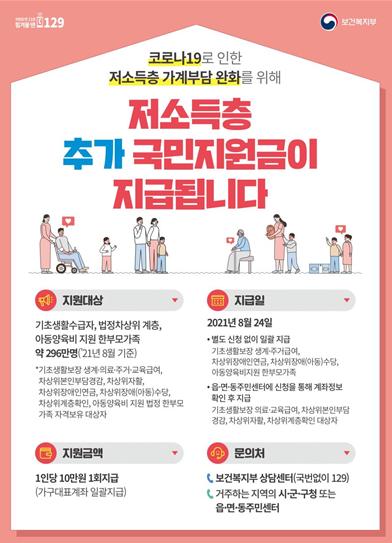 [한국쇼핑몰뉴스, 최영진기자] 코로나19가 지속되는 상황으로 경제적 어려움 등 생계의 위협을 받는 취약계층에 대한 두터운 보호를 위해 저소득층 296만 명에게 1인당 10만 원씩 추가 국민지원금을 8월 24일(화)에 지급된다.