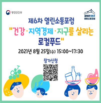행정안전부와 농림축산식품부는 8월 25일 오후 3시, “건강·지역경제·지구를 살리는 로컬푸드”를 주제로 2021년 제6차「광화문1번가 열린소통포럼」을 개최한다고 밝혔다.