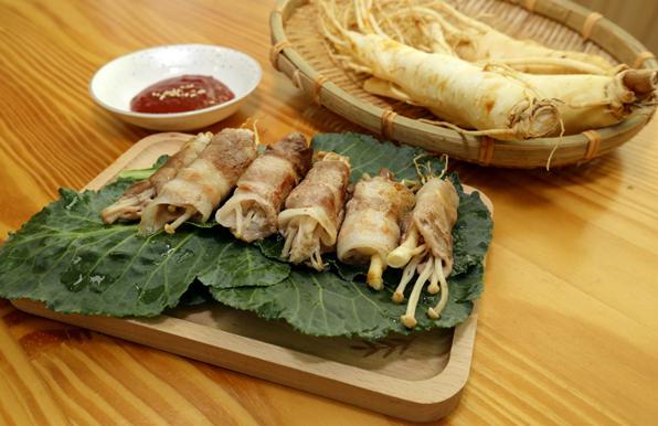 대패 삼겹살을 이용해도 좋다. 고기 위에 감자 칼(필러)로 얇게 썬 인삼과 팽이버섯을 올린 뒤 돌돌 말아 프라이팬에 굽는다. 이때 삼겹살이 풀리지 않게 하려면 고기 이음새 부분을 먼저 익혀준다.