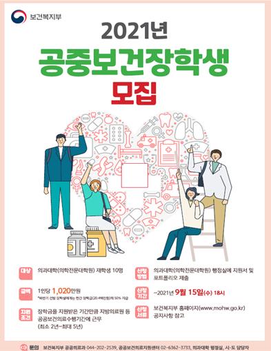 올해는 의학전문대학원생을 포함한 의과대학생과 더불어 간호대학생까지 공중보건장학생으로 선발하여 2021년 현재 의대생 10명, 간호대생 21명에게 장학금을 지원하고 있다.