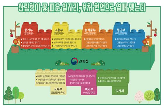 한편, 농식품부 주관 ‘신활력플러스사업’과 행정안전부 주관 ‘지역주도형 청년일자리 지원사업’ 등에는 산림청 산림일자리발전소 발굴 그루경영체(주민공동체) 등이 참여하여 사업 고도화를 위한 협업을 진행하고 있다.