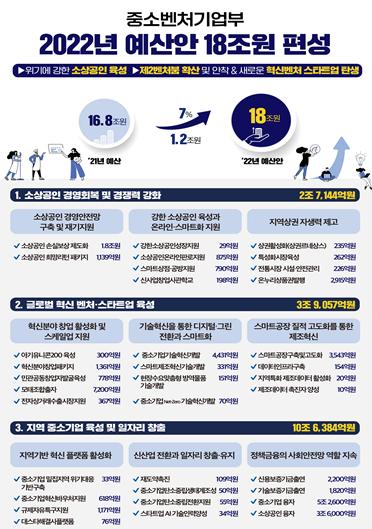 [한국쇼핑몰뉴스, 최영진기자] 중소벤처기업부는 2022년도 예산안을 2021년 예산(16조 8,240억원) 대비 1조 1,807억원 증액(7%)한 18조원으로 편성하고 9월 3일 국회에 제출할 예정이라고 발표했다.