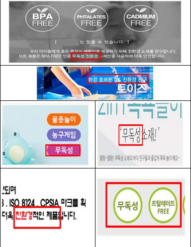 환경부와 한국환경산업기술원은 올해 7월부터 두 달간 판매량 상위 19개 '어린이 목욕 완구' 제품에 대한 온라인 광고 실태를 조사했으며, 그 결과 18개 제품(94.7%)의 광고에서 명확한 근거 없이 '친환경', '무독성' 등의 용어를 사용하고 있는 것으로 확인됐다.
