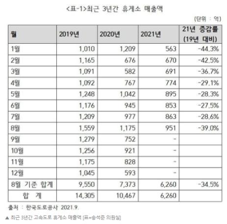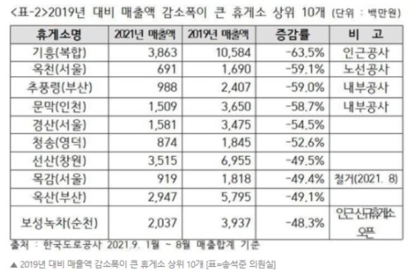 지난 2019년 대비 올해 매출액 감소폭이 가장 큰 휴게소는 기흥(복합)휴게소(63.5%)였으며, 이어 옥천(서울)휴게소(59.1%), 추풍령(부산)휴게소(59.0%) 문막(인천)휴게소(58.7%) 순으로 매출액 감소폭이 컸다.