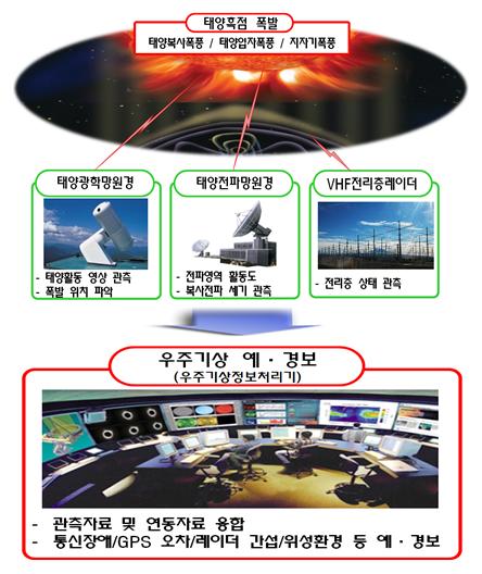 우주기상 예ㆍ경보체계는 태양광학망원경을 통해 태양활동을 영상 관측하고, 태양전파망원경을 통해 태양 전파를 측정하며, 전리층레이더를 통해 지구의 전리층 상태를 관찰한다.