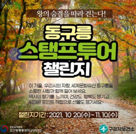[한국쇼핑몰뉴스, 최영진기자] 문화재청 궁능유적본부 조선왕릉동부지구관리소는 구리시 보건소와 맺은 첫 협업으로 오는 20일부터 11월 10일까지 ‘이 가을, 왕의 숨결을 따라 걷다! 세계문화유산 동구릉 걷기 행사’를 개최한다.