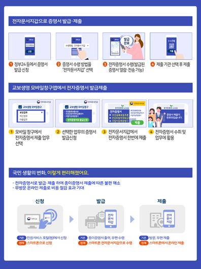 이러한 전자증명서 활용은 종이증명서 출력과 제출로 인한 번거로움과 이동에 따른 시간 및 비용부담도 동시에 절감할 수 있다.