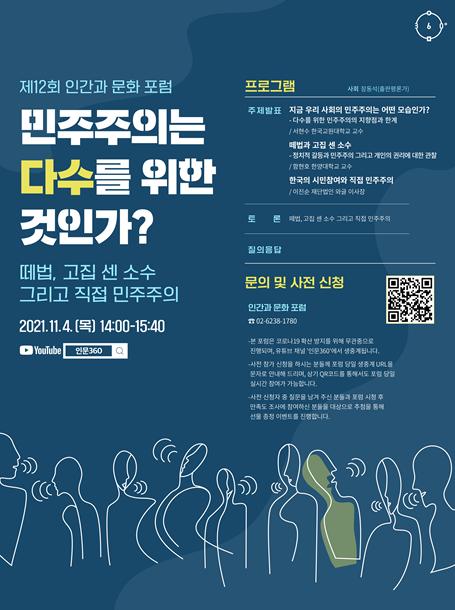 이번 토론회는 누구나 볼 수 있도록 온라인*으로 생중계한다. 시청을 원하는 경우 11월 3일까지 인문360°누리집에서 참가 신청을 하면 중계 영상에 바로 접속할 수 있는 인터넷 주소(URL)를 안내받을 수 있다.