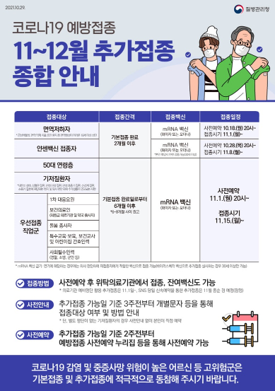 [한국쇼핑몰뉴스, 최영진기자] 코로나19 예방접종, 11~12월 추가접종대상에 따른 접종계획을 확인하세요!