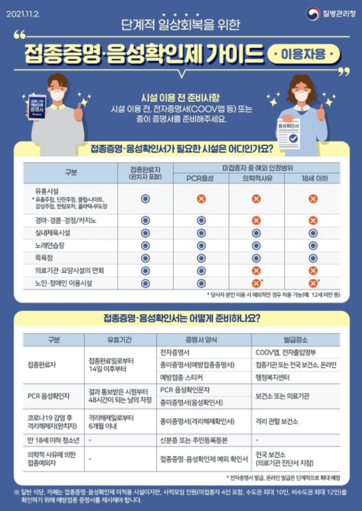 ※ 일반 식당, 카페는 접종증명·음성확인제 미적용 시설이지만, 사적모임 인원(미접종자 4인 포함, 수도권 최대 10인, 비수도권 최대 12인)을 확인하기 위해 예방접종 증명서를 제시해야 합니다.
