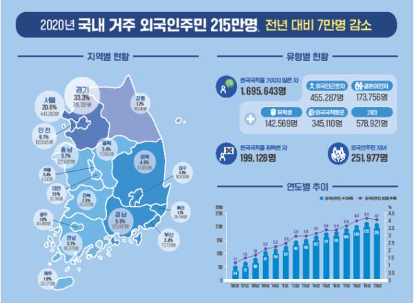 행정안전부는 통계청의 인구주택총조사 자료를 활용하여 『2020 지방자치단체 외국인주민 현황(2020.11.1. 기준)』을 발표하고 우리나라에 거주하는 외국인주민은 모두 214만 6,748명인 것으로 조사됐다고 밝혔다.