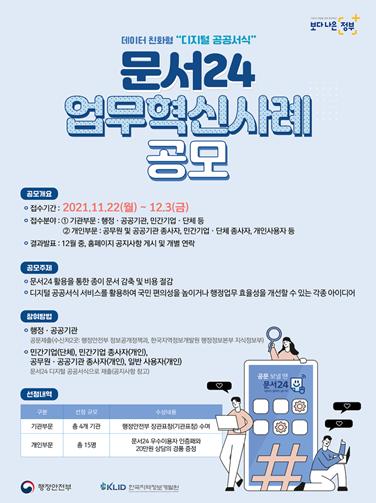 [한국쇼핑몰뉴스, 최영진기자] 행정안전부는 11월 22일부터 12월 3일까지 문서24 서비스를 활용한 정부와 기업의 업무혁신 아이디어 공모전을 개최한다.