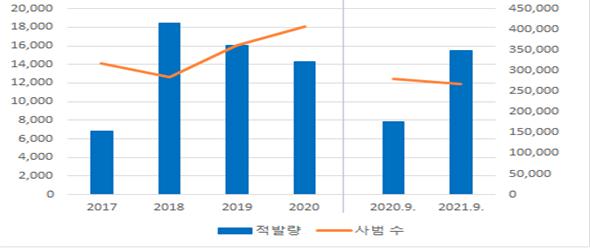 마약류 관리와 관련하여 올해 3분기까지 거둔 주요 성과로는,?관계기관 협업을 토대로 대규모 밀수입 등 중대 범죄를 집중 단속함으로써 해외 마약류의 국내 유입을 적극 차단하였으며, 의료용 마약류 처방 정보에 대한 빅데이터 분석을 토대로 먼저 의료기관 자정노력을 유도하고 이후 선별점검을 실시한 결과 오·남용 의심 의사 수는 감소하고 위반사례 적발률은 증가하였다.