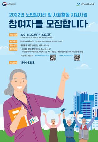 [한국쇼핑몰뉴스, 최영진기자] 보건복지부는 11월 29일부터 12월 17일까지 2022년 노인일자리 및 사회활동 지원사업(공익활동, 사회서비스형, 시장형사업단)의 참여자 모집을 시작한다고 밝혔다.