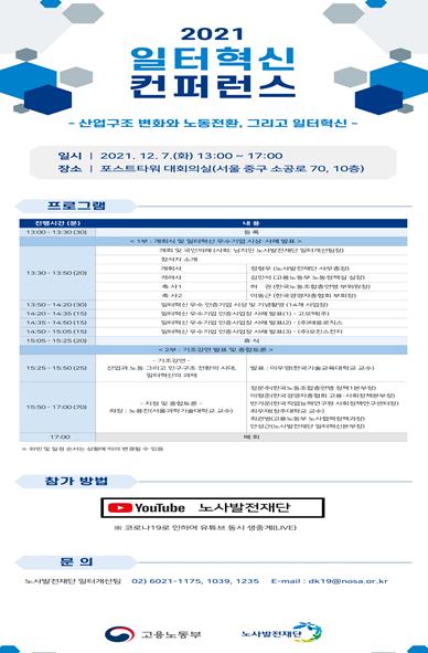 [한국쇼핑몰뉴스, 최영진기자] 고용노동부와 노사발전재단은 12.7. 13시 30분, 포스트타워(서울 중구 소재)에서 「2021년 일터혁신 컨퍼런스」를 개최했다.