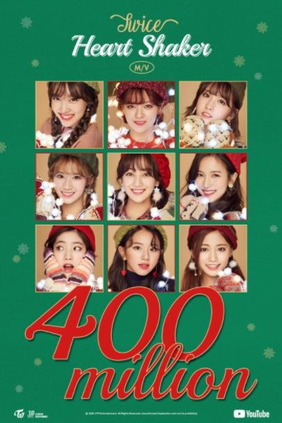 [한국쇼핑몰뉴스, 최영진기자] 11일 소속사 JYP엔터테인먼트에 따르면 트와이스가 지난 2017년 12월11일 공개한 정규 1집 리패키지 앨범 '메리 앤 해피(Merry & Happy)'의 타이틀곡 '하트 셰이커' 뮤직비디오가 전날 오후 5시58분께 유튜브 4억 뷰를 달성했다.