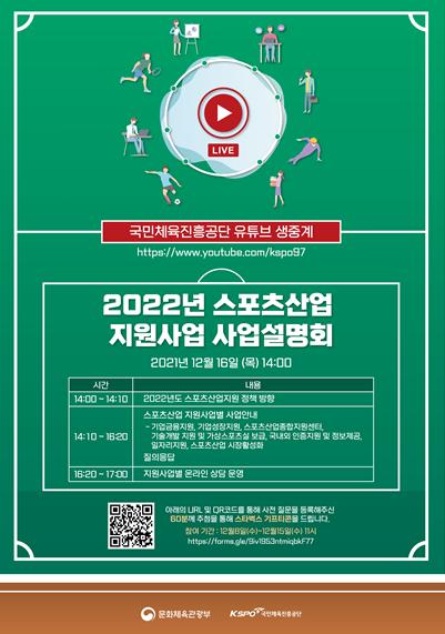 [한국쇼핑몰뉴스, 최영진기자] 문화체육관광부는 국민체육진흥공단과 함께 12월 16일 오후 2시, ‘2022년 스포츠산업 지원 사업 설명회’를 개최하고 체육공단 유튜브 채널을 통해 온라인으로 생중계한다.