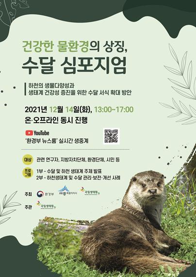 [한국쇼핑몰뉴스, 최영진기자] 환경부는 세종특별자치시 및 국립생태원과 ‘건강한 물환경의 상징, 수달 학술회(심포지엄)’를 12월 14일 세종시 정부세종컨벤션센터에서 개최한다.